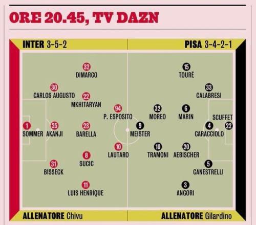 根据米体的赛前预测,本场国米将继续进行一定的阵容轮换。上一场欧冠对阿森纳,劳塔罗和巴雷拉提前被换下场,其实就是为了这一场做准备。劳塔罗和皮奥联袂搭档锋线,“皮劳组合”经过多场比赛验证效果不错,特别是皮奥在前场的支点作用为劳塔罗创造了很多进攻机会。中场巴雷拉出任后腰,连续出战的泽林斯基终于迎来轮休,恰尔汗奥卢还没回归,他可得省着点用,姆希塔良重回首发,上一场对阵阿森纳表现不错的苏契奇则再次出战。两边翼卫迪马尔科和恩里克基本没有疑问,阿坎吉、比塞克和奥古斯托搭档后防线,巴斯托尼轮休。